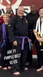 Just under one year later, right before turning 72 last month, I received my purple belt.