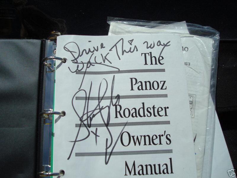 He even autographed the car under the hood, and on the owner’s manual (writing, “Drive this way”).